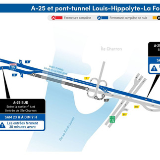 • Fermeture complète de la bretelle menant de l’autoroute 40 ouest vers l’autoroute 25 sud.