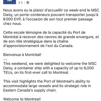 “The arrival of the MSC Daisy demonstrates that the Port of Montreal is equipped to meet the rising demands of international maritime trade, while further establishing its role as a vital logistics hub for the country,” said a spokesperson from the Port Authority.